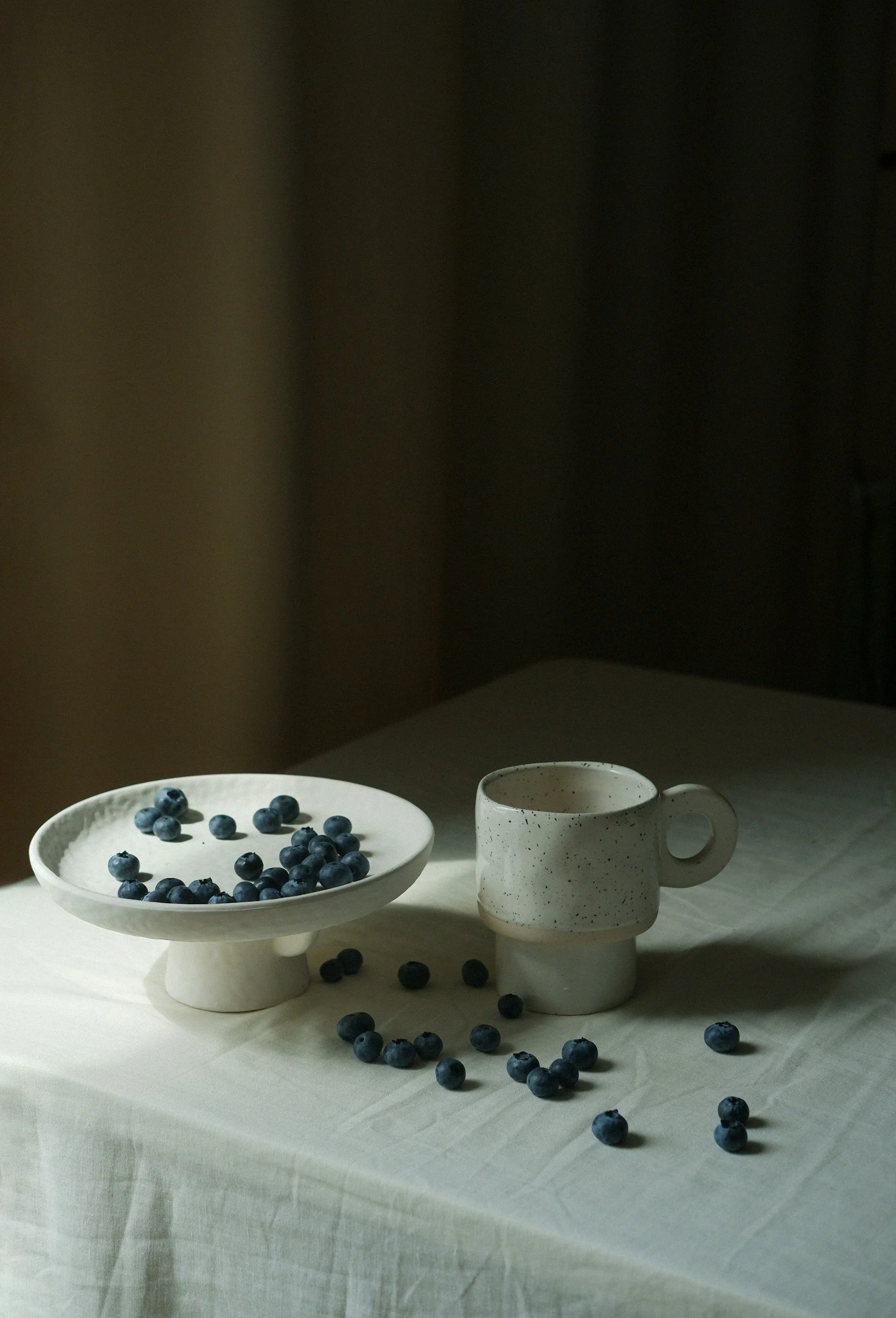 A collection of pottery and table linens